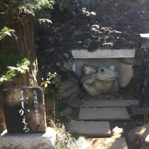 品川神社境内の浅間神社左手には、かわいいカエルの親子が。